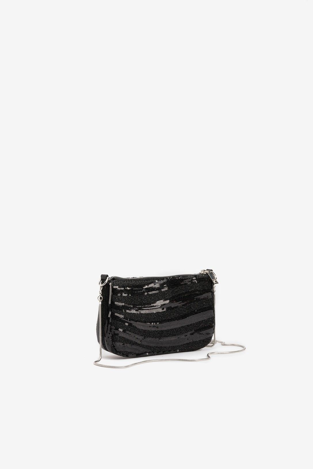 Cartera de fiesta en negro con lentejuelas brillantes y cierre de cremallera metálica plateada