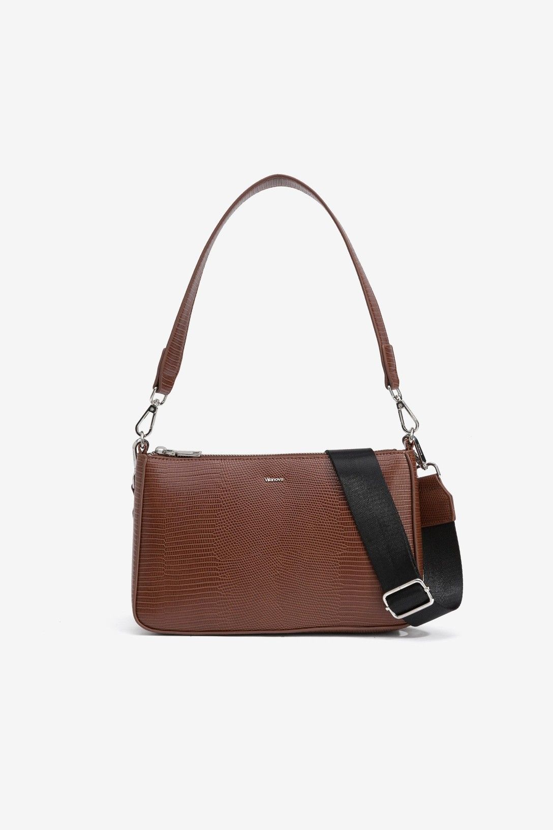 Bolso bandolera de efecto piel granulada, con cierre superior de cremallera y asa de hombro removible. Correa ajustable y removible, con bolsillo interior de cremallera. Tamaño pequeño. Dimensiones: 25,5 x 16 x 7 cm
