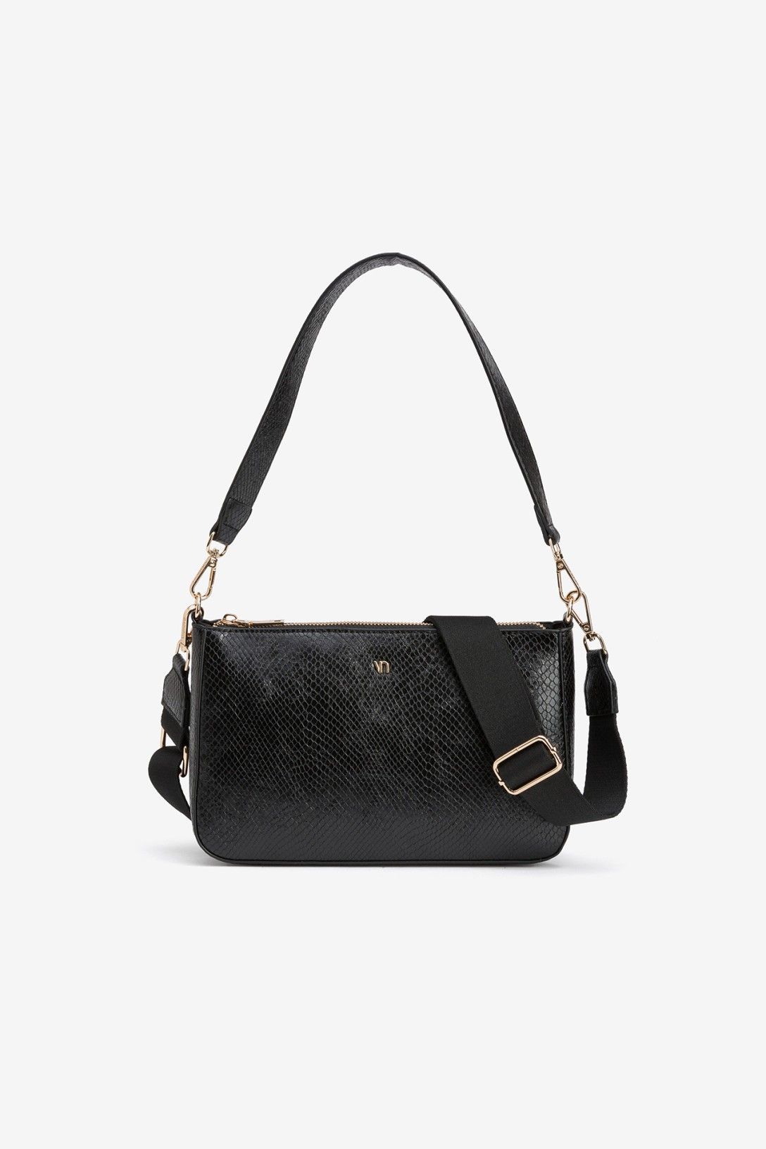 Bolso bandolera en efecto piel de serpiente, con cierre superior de cremallera, asa de hombro fija y asa bandolera ajustable y removible. Bolsillo interior con cierre de cremallera. Tamaño pequeño. Dimensiones: 24 x 6 x 7 cm