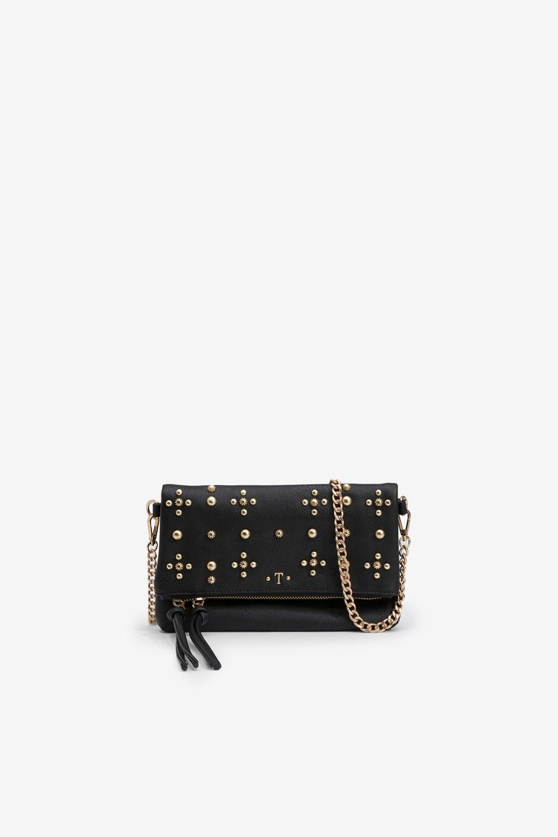 Bolso bandolera efecto piel con aplicación de tachuelas metálicas y perlas decorativas en la solapa. Cierre con cremallera y botón oculto. Correa de hombro en cadena metálica dorada.