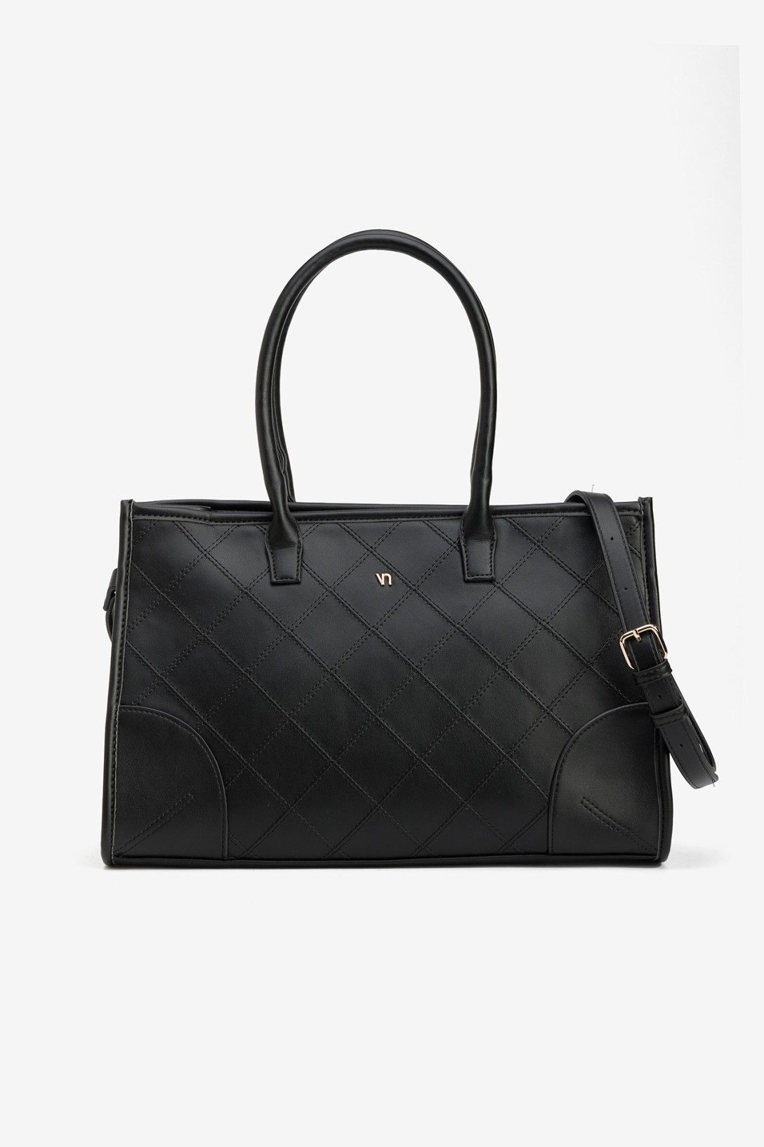 Bolso negro con diseño acolchado, asas dobles y detalles metálicos dorados. Estilo sofisticado y moderno.