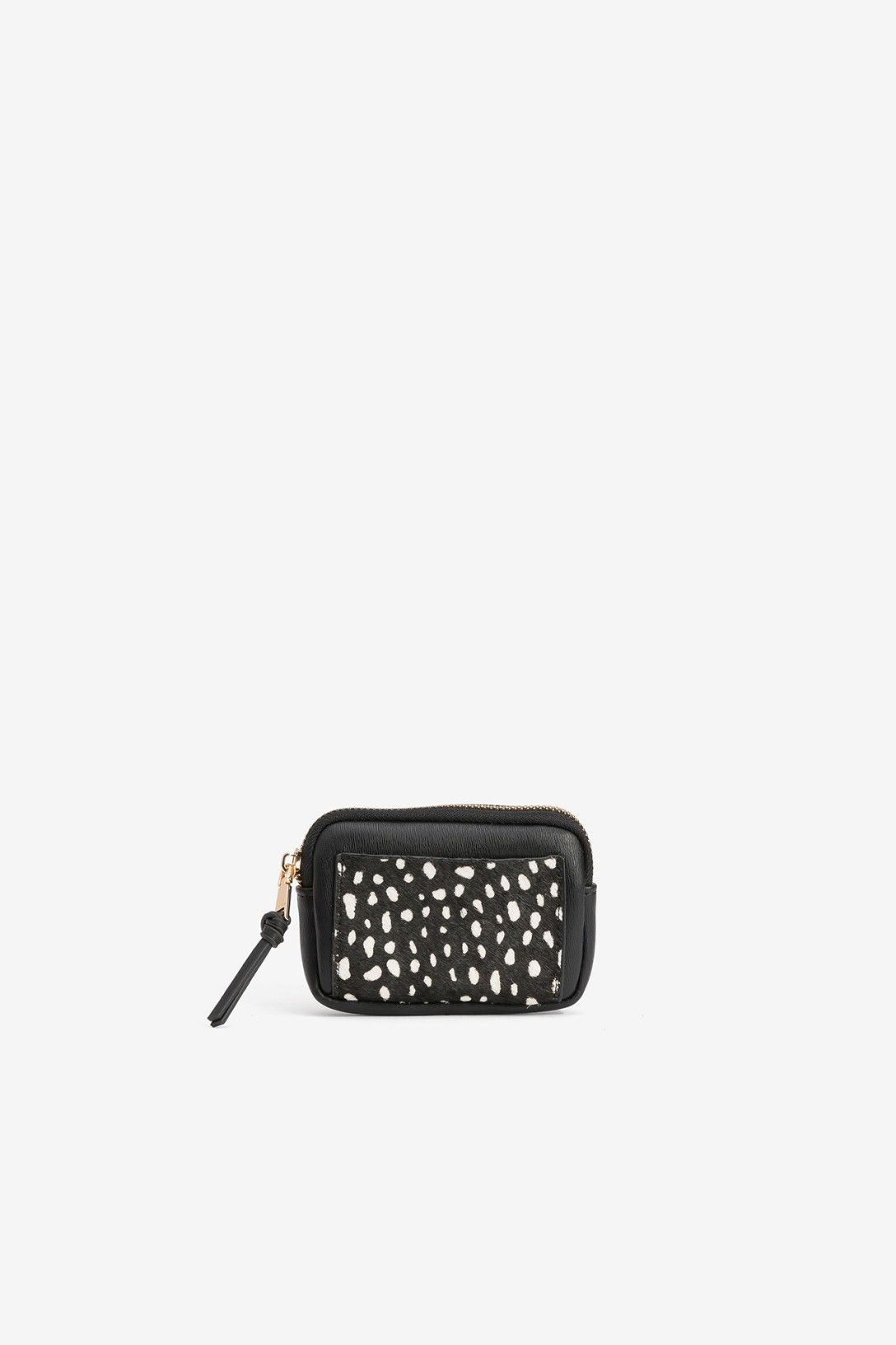 Porta monedas negro con detalle estampado blanco y negro, cierre de cremallera dorado y diseño compacto.