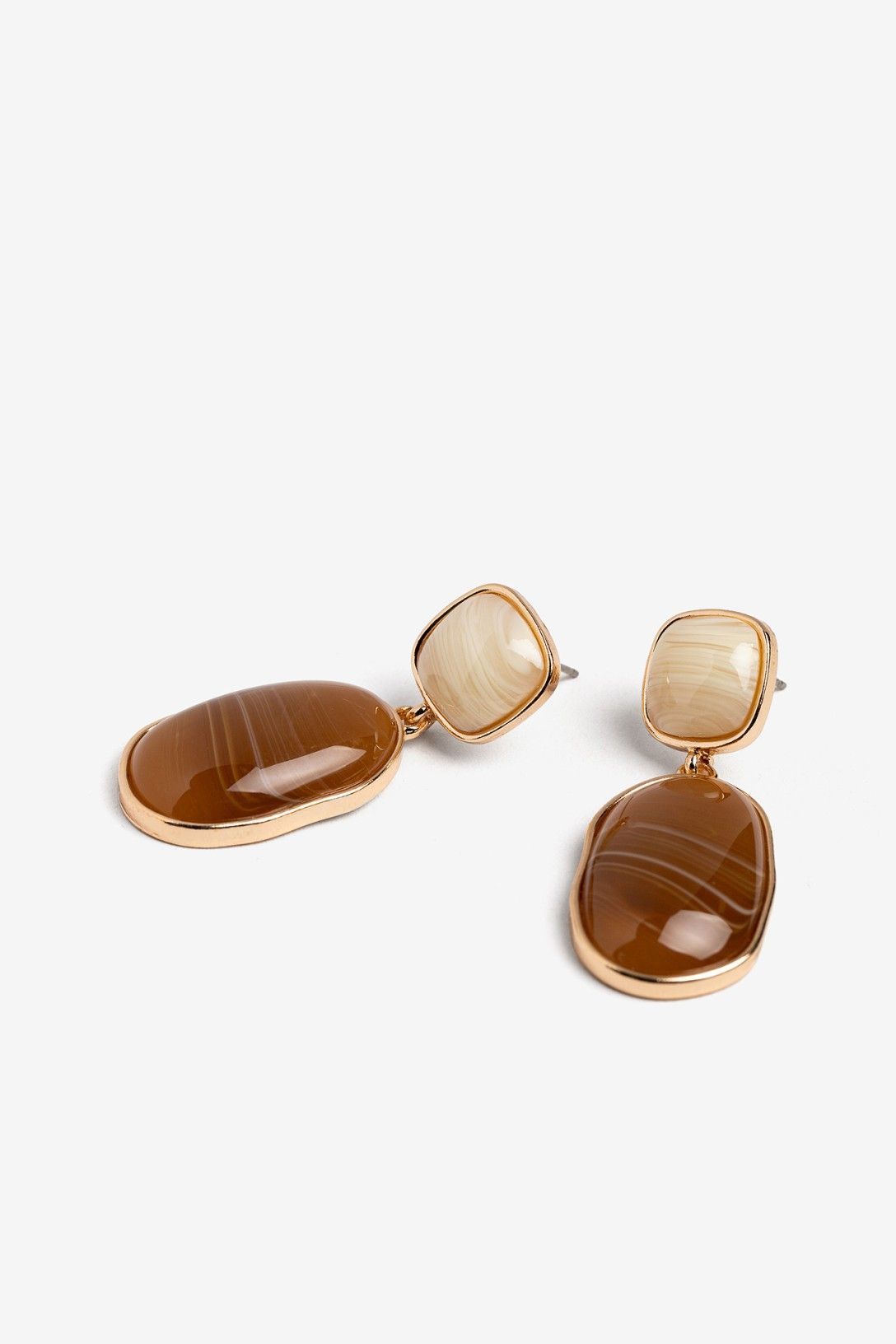 Pendientes dorados con piedras ovaladas en tonos marrón y beige, diseño moderno y sofisticado.